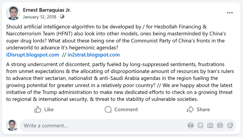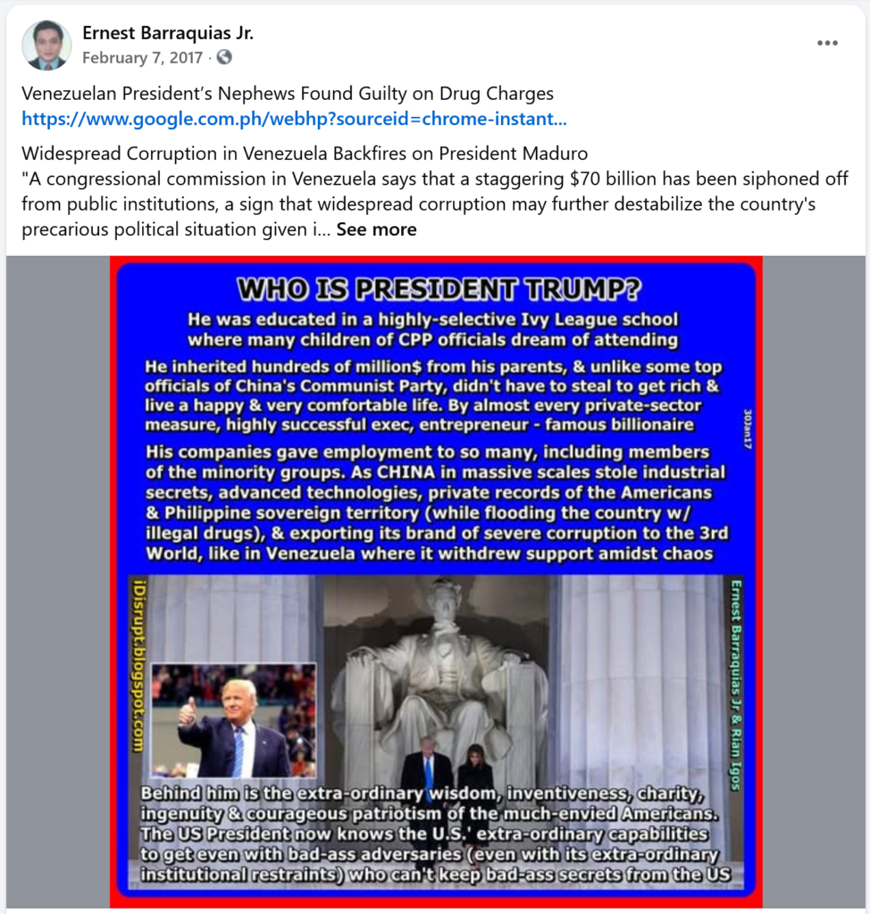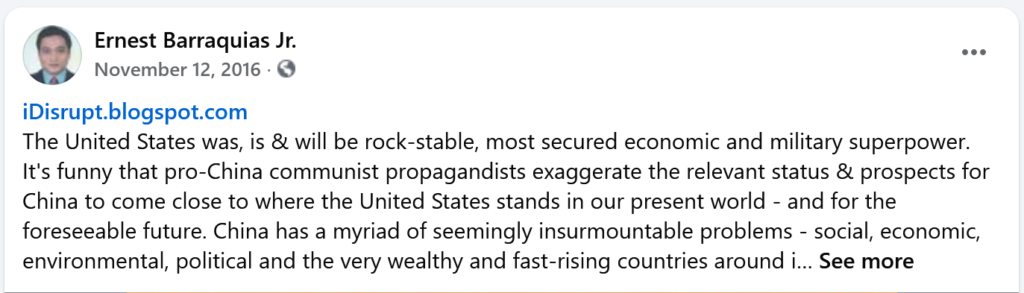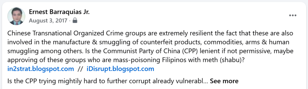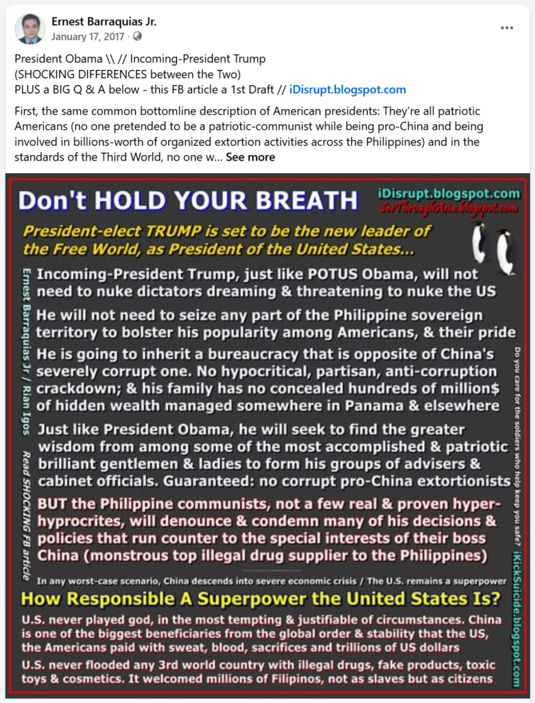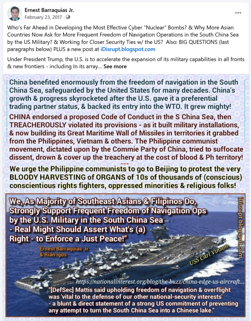During the period of 2016-2022, I did it consistently online and offline, when it was dangerous to argue against local communists (political operatives of the NPA, terror-tagged by the State Department and many Western powers) who were using their then still-mighty propaganda to mock and portray President Trump in a very bad light as they ignore and not speak up against murderous regimes including that of the Chinese Communist Party of China led by its appointed dictator, reason why I called the local communists and Chinese communists CPP (supposedly an acronym for the Communist Party of the Philippines, interchangeably with the CCP).