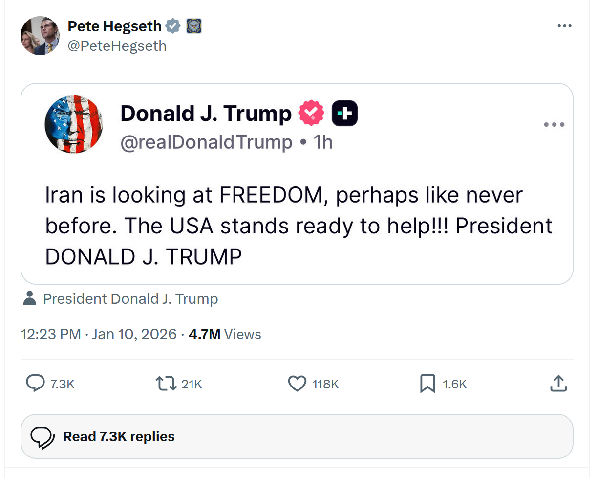 “If a regime can only cling to power through violence, then it’s effectively over anyway,” Merz said. “I believe that we are currently witnessing the final days and weeks of this regime … has no legitimacy from popular elections anyway. The people are now rising up against this regime. I hope there is a way to end this conflict peacefully….” – German Chancellor Friedrich Merz
